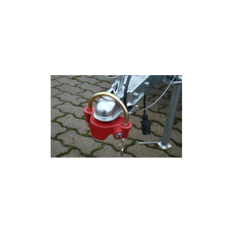 utilisée pour bloquer le timon de la remorque afin d'empêcher une fixation non autorisée au crochet du véhicule. Le verrouillage s'effectue en insérant l'anneau du bras inférieur dans la douille à bille du crochet et en appuyant sur la goupille en acier jusqu'à ce que le verrou s'enclenche. L'ouverture n'est possible qu'avec une clé.